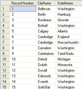 ROW_NUMBER() OVER ( PARTITION BY [StateName] ORDER BY [CityName]) AS ‘Record Number’, [CityName],[StateName]